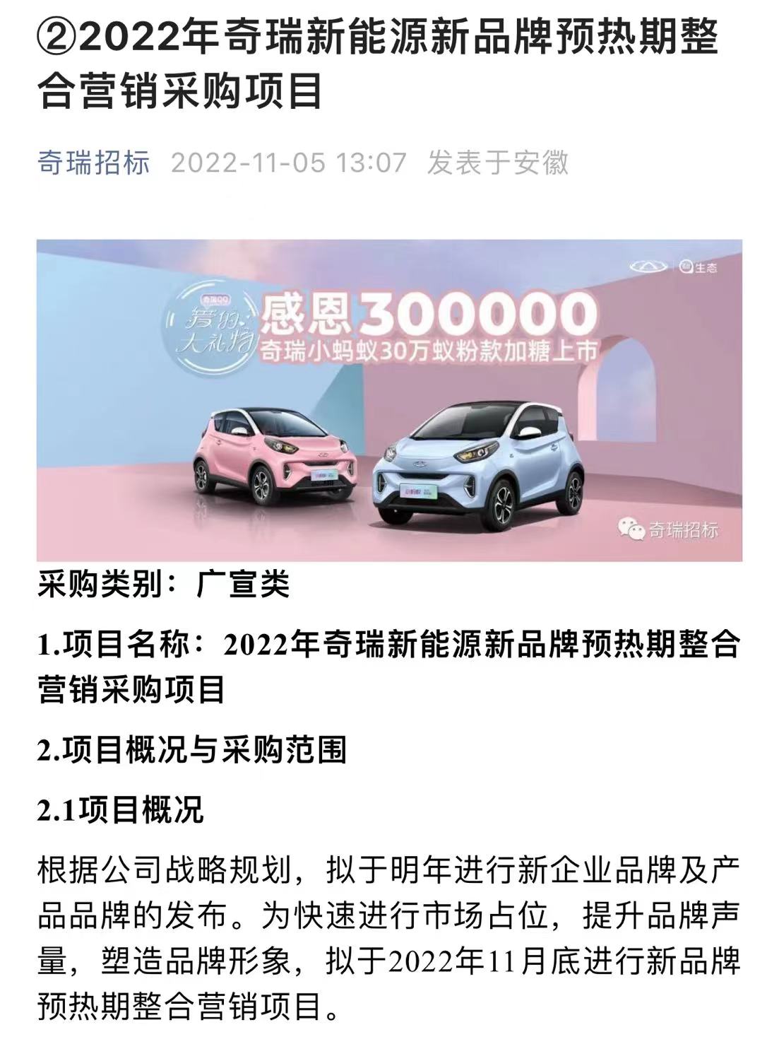 近日,有外媒报道称,奇瑞将在未来推出全新高端品牌,更多细节将在2023年年初透露。在此不久前,奇瑞官方曾发布招标信息,招募宣发团队于今年年底为即将推出的新能源品牌进行预热营销。