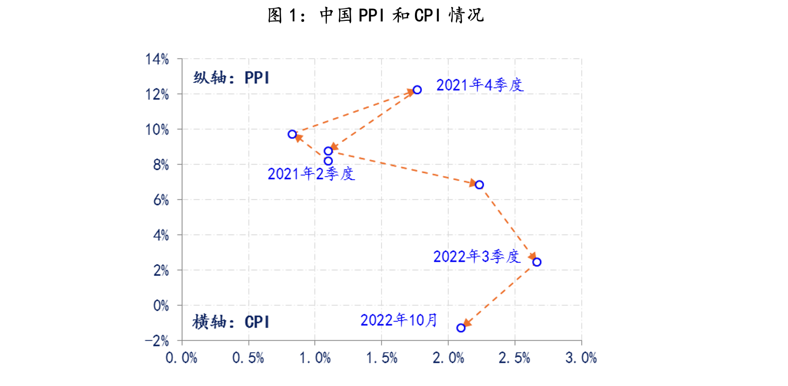 与海外多国通胀持续高企不同,我国的物价情况继续保持着平稳态势。例如,10月份CPI和PPI同比涨幅分别为2.1%、-1.3%,相应前10个月,CPI累计同比涨幅2.0%,较上年提高了1.1%,而PPI累计同比涨幅5.2%,较上年下降了2.9%。与此同时,欧美多国的通胀涨幅依然位于高位,即便是多年处于通缩的日本,其CPI涨幅也已连续两个月保持在3%的水平。因此,从某种程度而言,经济面临了阶段性 “外胀内缩”的通胀局面。
