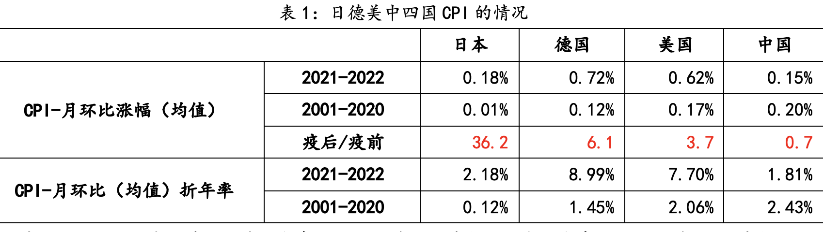 除了当下通胀存在的内外差异之外,实际上内外通胀的中长期表现与边际变化更需要格外关注。为此,我们选取了日本、德国、美国与中国作为样本,观察比较的重点确定为疫后复苏前后两个阶段的情况,数据范围为新世纪以来。