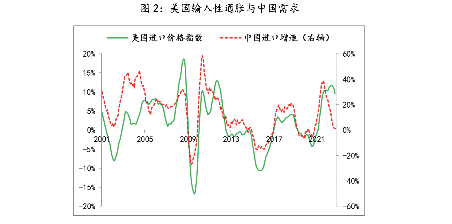 然而,从目前的情况来看,与海外需求过热不同,我们主要还是面临总需求紧缩的问题。在某种程度上讲,我们的需求紧缩甚至还起到缓解海外通胀的作用——中国需求的紧缩缓解了海外的输入型通胀压力。例如,从美国进口价格涨幅与中国进口增速的同比关系就反映出了此点。