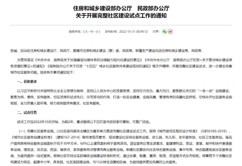 10月底,住建部、民政部联合发布《关于开展完整社区建设试点工作的通知》,提出各市(区)应选取3至5个社区开展完整社区建设试点,试点社区应规划建设社区综合服务设施、幼儿园、老年服务站、食堂等系列便民商业服务设施,试点时间自2022年10月开始,为期2年。