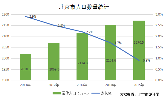 供需是市场的产物,供需比影响着楼市房价。下图为北京市2011年至2015年,北京市常住人口新增数量统计,虽近几年增速放缓,但新增常住人口数量还是高达18.9万。源源不断的人口涌入,意味着北京楼市中源源不断的买房需求。