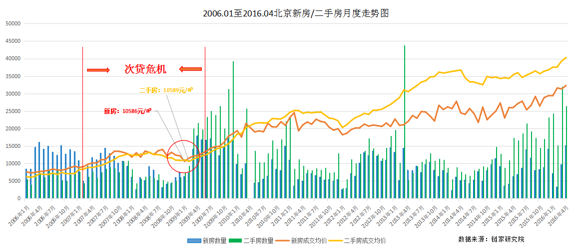 结合北京房价的走势,即使在遭遇金融危机时,房价依然可以保底不崩盘。2008年1月至2009年12月,新房最低房价为10586元/㎡,二手房最低房价为10589元/㎡。次贷金融危机一过,北京的房价开始迅速增长,虽有起伏,但总体趋势呈上扬状态。