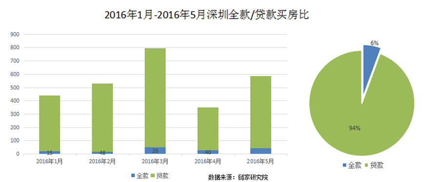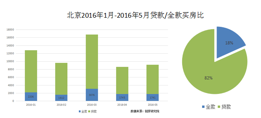 同时,虽然贷款利率低,但北京楼市的信贷环境比较健康。比价明显的例子是深圳,下图为北京和深圳2016年1月至5月,全款买房和贷款买房客源比的统计,可以看出,北京全款买房客户占比18%,而深圳仅占总数的6%。假设出现经济危机,不管是自住还是投资,房子本身的资本是保住了。