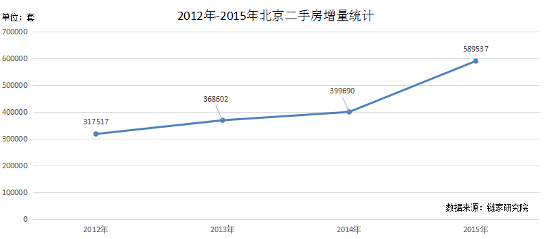我们再来看供给量。如图,北京2012年-2015年,市场上每年新增的二手房房源数量持续走高。但新盘入市数量开始走低。二手房房源数量受改需族影响,增量较大。就目前来看,北京楼市供需比较合理。