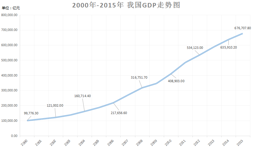 下图为我国2000年-2015年GDP的走势,从走势图中可以看到,我国一直处于经济增长的状态。2008年美国发生金融危机时,对我国的经济造成了冲击,但我国的GDP增长率依然达到了9.1%。中国还是一个发展中国家,经济发展潜力大,虽然经济学家对中国未来的经济唱衰,但是从目前来看,可以对我国的经济走势充满信心。