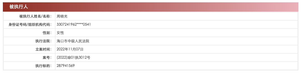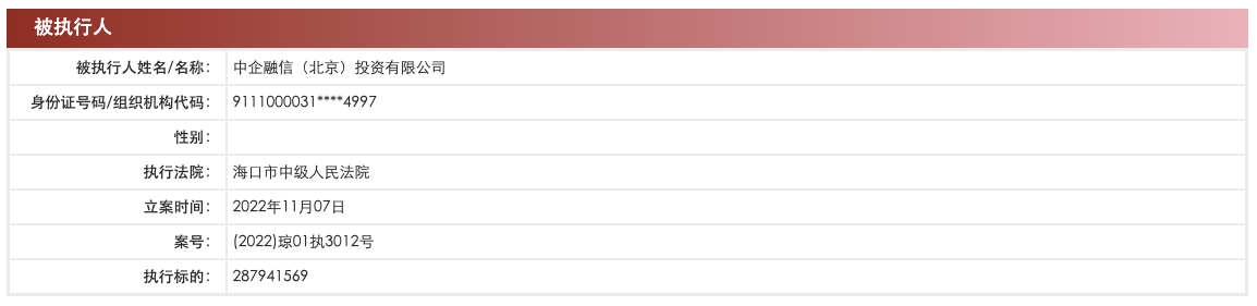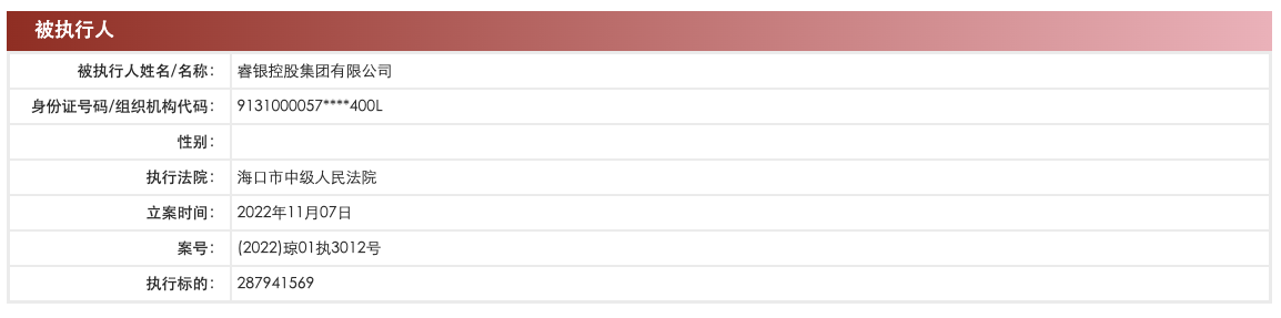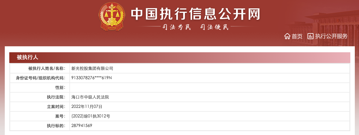 中国执行信息公开网显示,11月7日,新光控股集团有限公司及法定代表人周晓光、睿银控股集团有限公司、中企融信(北京)投资有限公司等新增被执行人信息,执行标的约2.88亿元,执行法院为海口市中级人民法院。