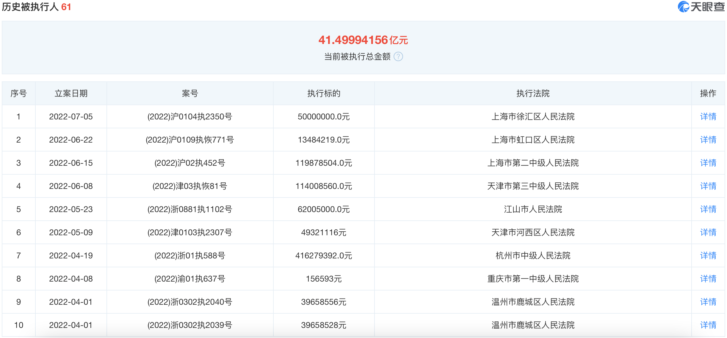 据天眼查统计,中国能源当前被执行总额高达41.50亿元。此外,由其100%控股的中能源资本司当前被执行总额为4.94亿元。
