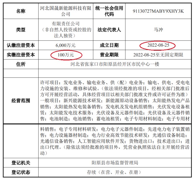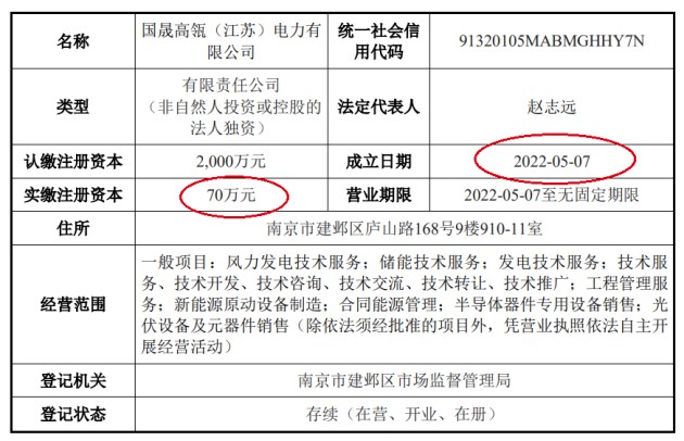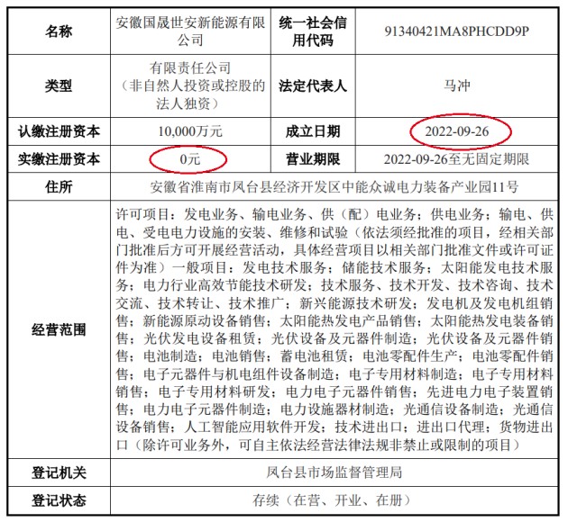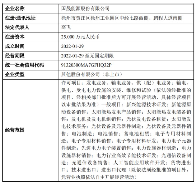 根据公告,国晟能源成立于今年年初(2022年1月29日),通过其全资子公司开展大尺寸高效异质结光伏电池、组件、硅片以及风光储能一体化电站开发运维等业务。