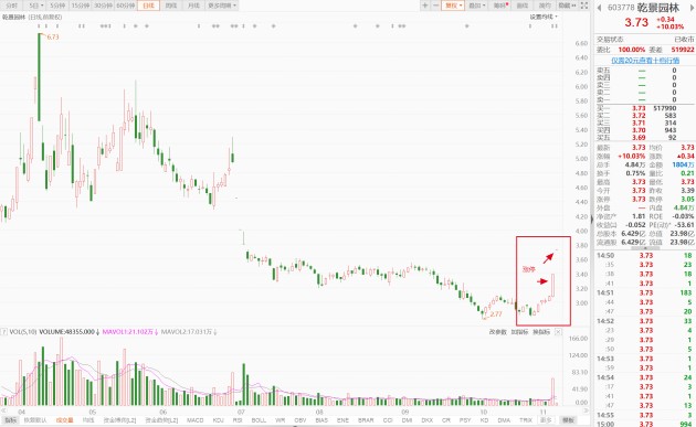 11月10日,乾景园林股票复牌,开盘即“一字涨停”,收于3.73元/股(+10.03%)。