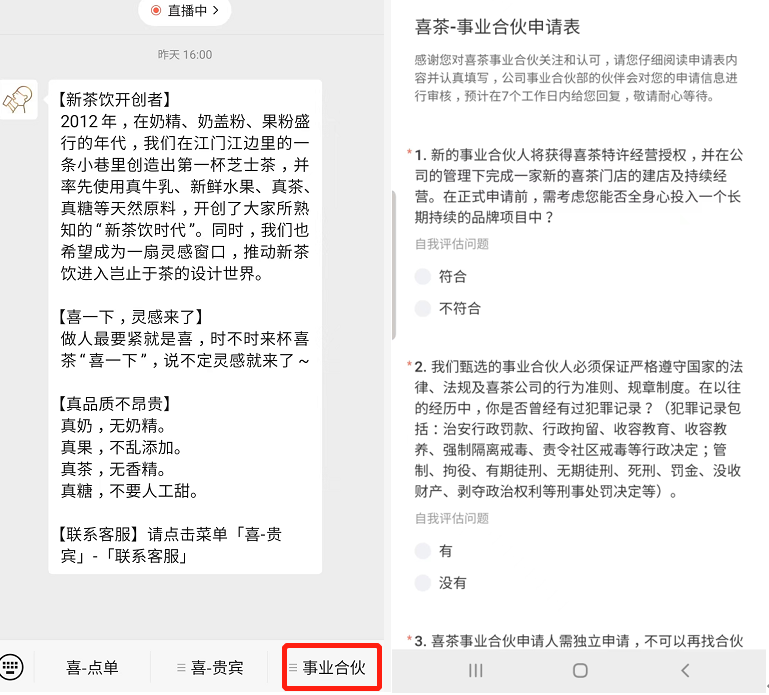 喜茶微信公众号的“服务”板块中,已经添加了“事业合伙”按钮,点击“合伙申请”,可以进入答题页面进行申请。但对于意向合伙人来说,申请只是万里长征的第一步。
