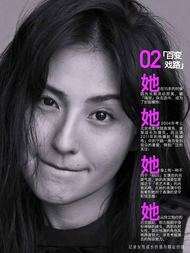 她,从特立独行的后宫嫔妃,到古装剧中身份神秘的婢女,再到农村女性,其所饰演的角色风格跨度较大,非常考验演员的驾驭能力。