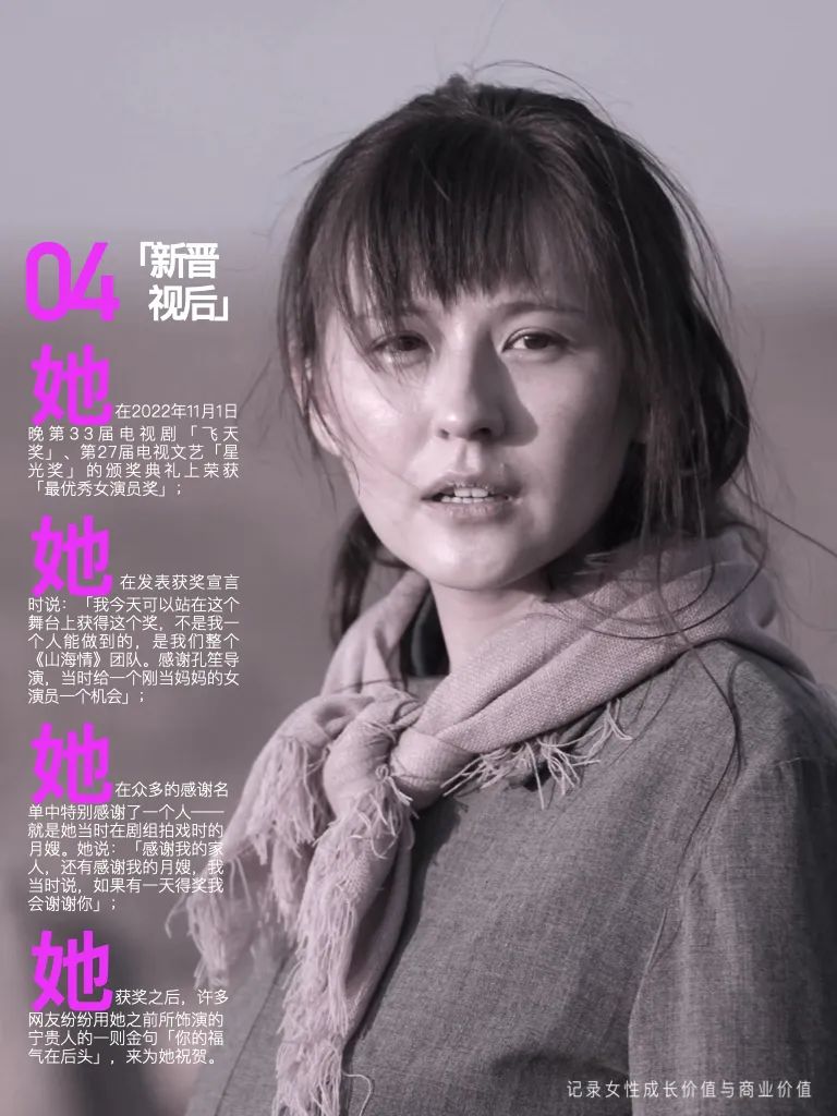 她,在2022年11月1日晚第33届电视剧「飞天奖」、第27届电视文艺「星光奖」的颁奖典礼上荣获「最优秀女演员奖」;
