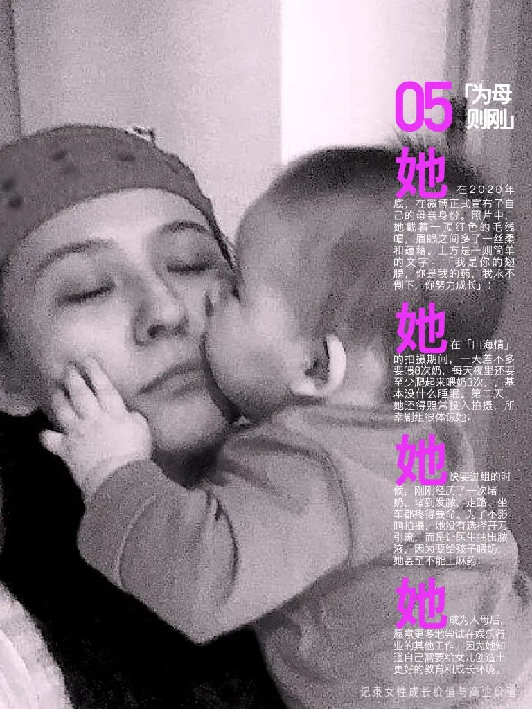 她,在2020年底,在微博正式宣布了自己的母亲身份。照片中,她戴着一顶红色的毛线帽,眉眼之间多了一丝柔和蕴藉。上方是一则简单的文字:「我是你的翅膀,你是我的药,我永不倒下,你努力成长」;