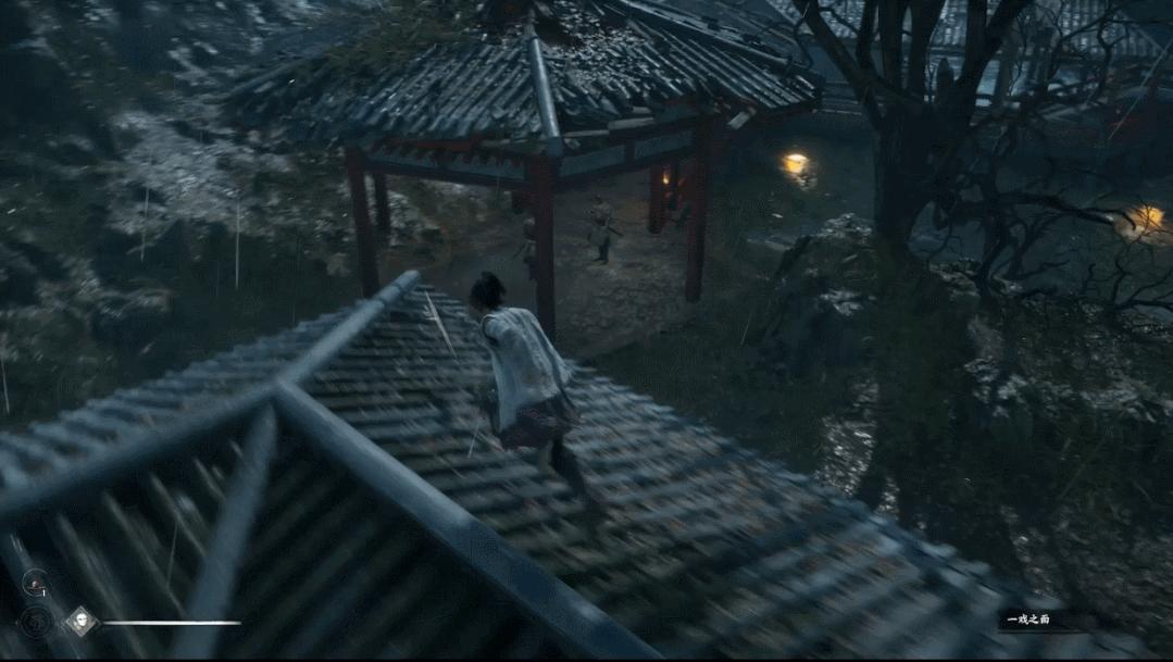 先是在庭院的场景中,展现了人物的跑动,跳跃,攀爬动作,并加入了在屋顶正面战斗和跳跃下屋檐从背面进攻的战斗展示。