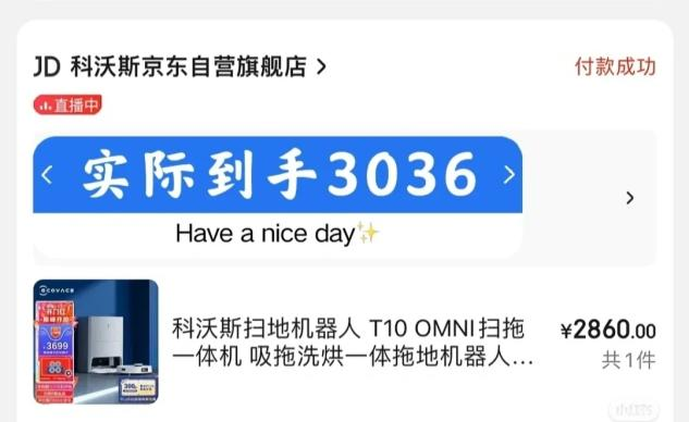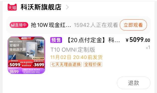双十一刚开始时,她发现科沃斯京东自营旗舰店,T10扫地机器人有了优惠,只要提前支付预售款,再叠加京东Plus会员,就能以3399元的低价,将商品收入囊中;于是,她在科沃斯开启预售时,果断支付了定金,并在尾款日当天,支付了剩余尾款。