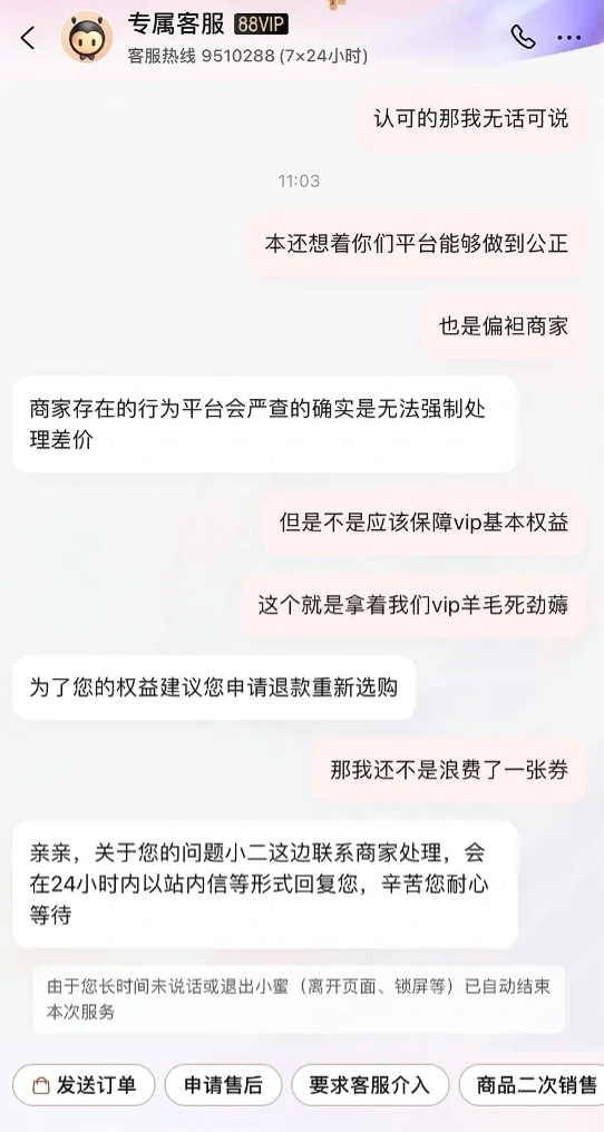 网友采薇表示,自己因为使用了88VIP,而遭遇了科沃斯的不退款后,立刻联系了天猫平台客服。对方核实后表示:"商家存在的行为,平台会严查的,但是确实无法强制处理差价。"