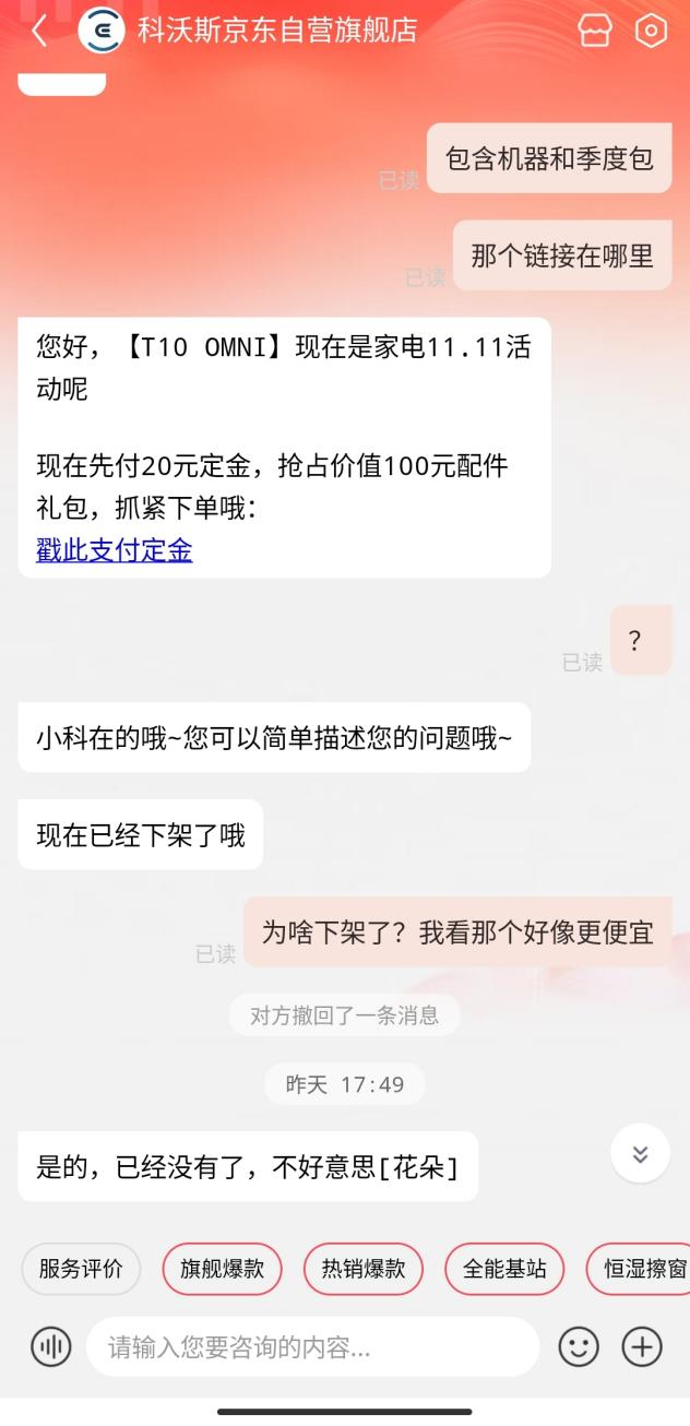 对于科沃斯京东自营旗舰店的阴阳链接,潘哥询问了科沃斯京东客服,对方表示:“之前的商品链接,已经下架了。”而对于下架原因,客服并未回复。