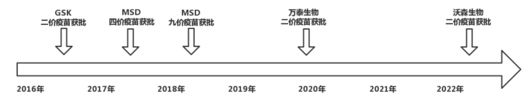 我国最早的HPV疫苗要追溯到2016年7月,葛兰素史克(GSK)的二价苗“希瑞适”成为第一款进入中国市场的HPV疫苗。2017年5月和2018年4月,由智飞生物独家代理的默沙东(MSD)四价和九价疫苗分别获批,由此也让国内HPV疫苗与国际同步。