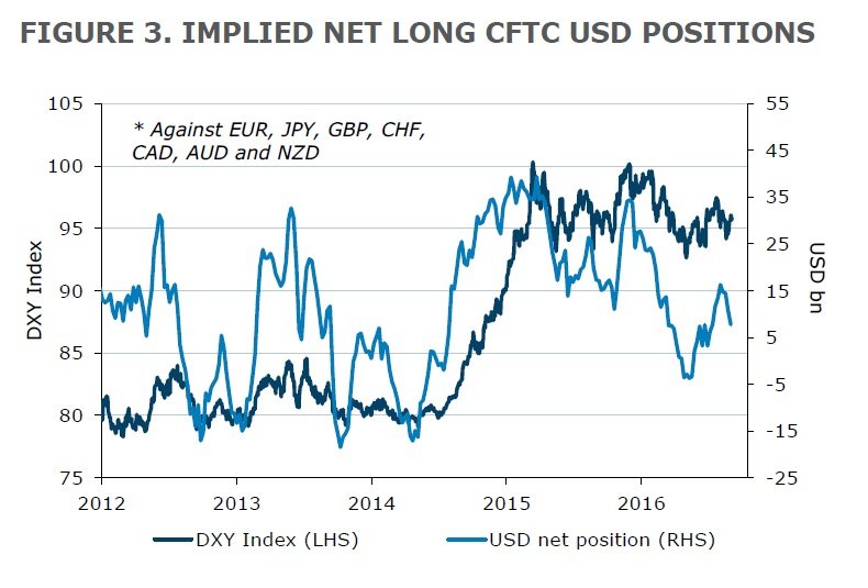 但同一时期的美元指数走势却与头寸背道而行。美联储主席耶伦8月26日在杰克逊霍尔举行的全球央行年会上表示,美联储加息的概率有所上升。美元指数随后上涨。