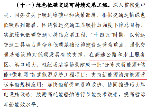 2022年3月30日,交通运输部就印发了《扎实推动“十四五”规划交通运输重大工程项目实施工作方案》。方案提出在“十四五”时期,要以营运交通工具动力革命和低碳基础设施建设运营为重点,强化交通基础设施对低碳发展有效支撑,在高速公路和水上服务区、港口码头、枢纽场站等场景建成一批“分布式新能源+储能+微电网”智慧能源系统工程项目;支持新能源清洁能源营运车船规模应用。