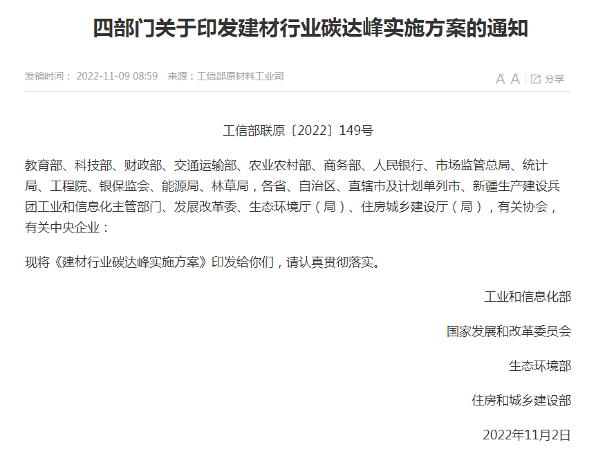 11月7日,工信部等四部门印发的《建材行业碳达峰实施方案》指出,优化建材行业能源结构,促进能源消费清洁低碳化,在气源、电源等有保障,价格可承受的条件下,有序提高平板玻璃、玻璃纤维、陶瓷、矿物棉、石膏板、混凝土制品、人造板等行业的天然气和电等使用比例。