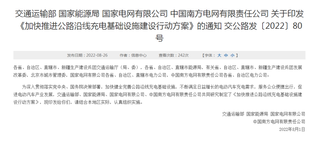 交通运输部、国家能源局、国家电网有限公司、中国南方电网有限责任公司印发《加快推进公路沿线充电基础设施建设行动方案》。方案要求加强高速公路服务区充电基础设施建设,重大节假日期间预测流量较大的服务区要提前做好应急预案,适当投放移动充电基础设施,满足高峰时段充电需求。