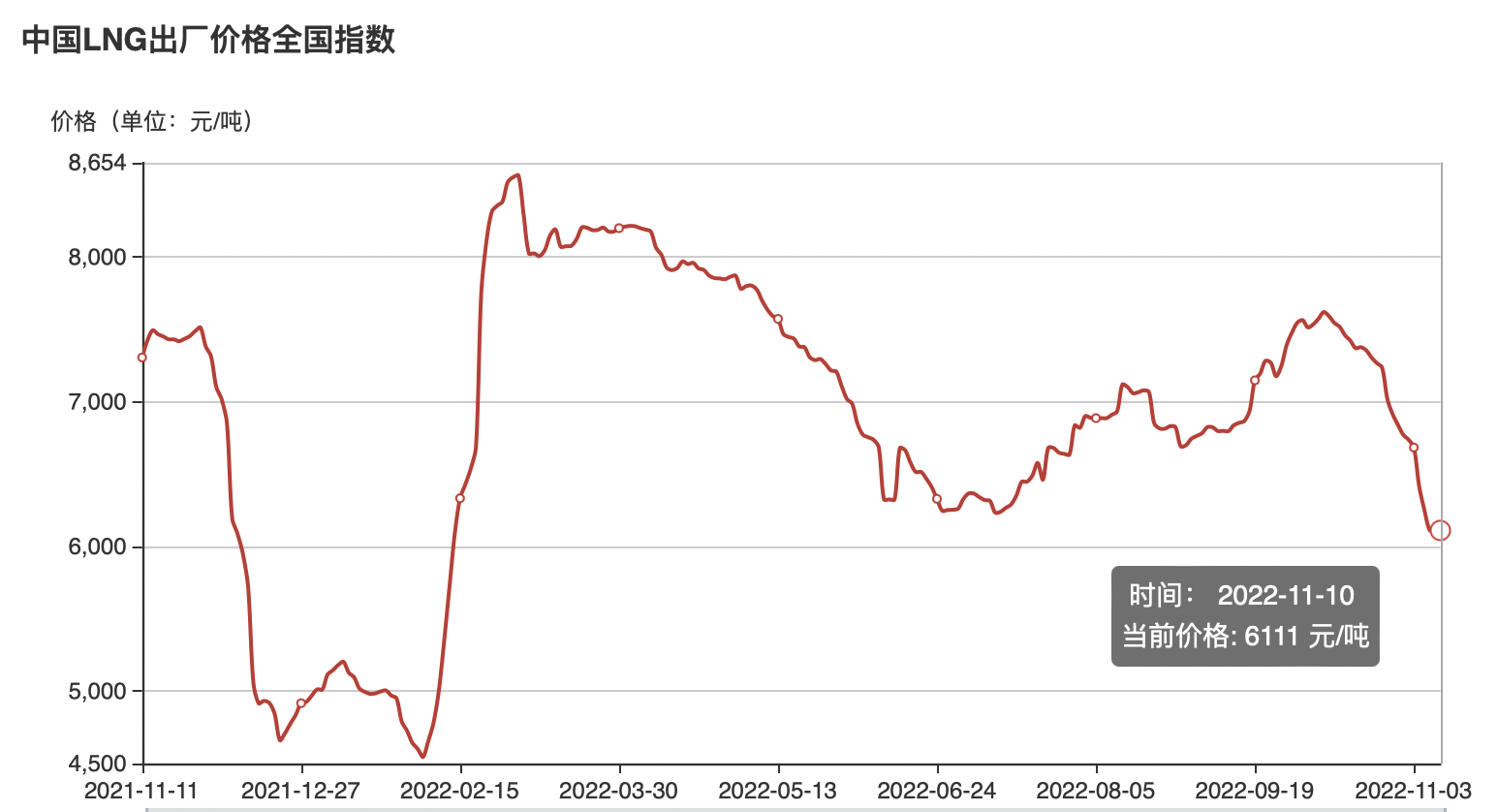 自10月11日以来,全国LNG价格指数一路走低。上海石油天然气交易中心数据显示,11月10日,中国LNG出厂价格全国指数为6111元/吨,月环比下降19.3%,同比下降16.4%。