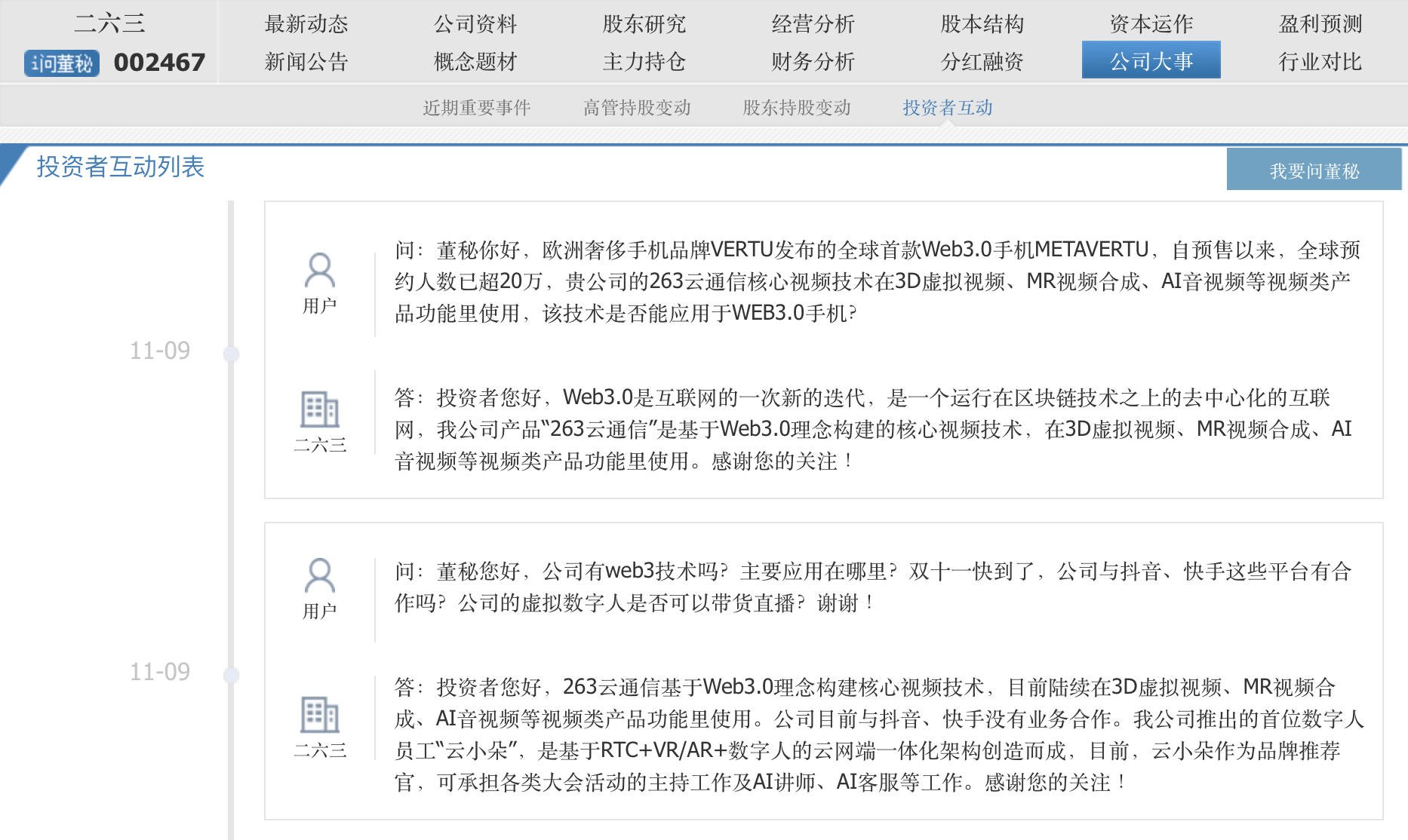 三五互联的话,根据2021年年报,公司在研究项目新一代的企业邮箱产品采用Web3.0模式,整合全新即时通讯及移动办公平台,由企业邮件解决方案升级为覆盖Windows、iOS、Android、MAC等主流系统的企业沟通解决方案。