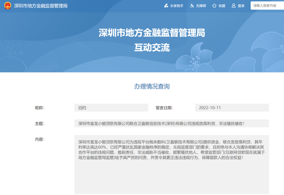 2016年-2017年,富金富还曾与我来贷达成合作,我来贷向富士康旗下蓝领工人提供信贷服务。就在今年10月11日,还有用户在深圳市地方金融监督管理局官网留言,称“深圳市富龙小额贷款有限公司为违规平台我来数科(卫盈联技术有限公司)提供资金,联合发放高利贷,其年利率达高达60%”。