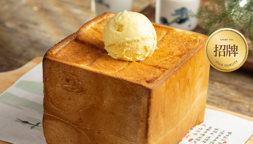 绿茶餐厅的招牌菜品“面包诱惑”——一份烤制的面包上放着一个冰淇淋球。