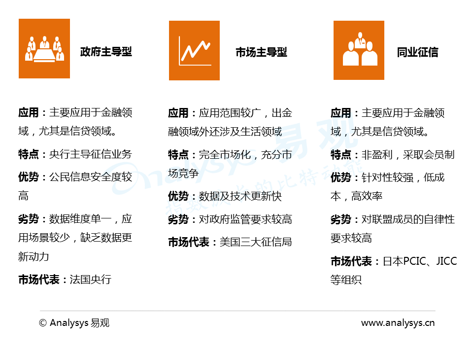 依据个人征信主体的不同,目前国际上主流的个人征信分为政府主导型、市场主导型以及同业征信三种模式。依据国情不同,三大个人征信模式各有特点,目前我国主要是以央行个人征信中心为主的政府主导型,但市场化的苗头也已显露。