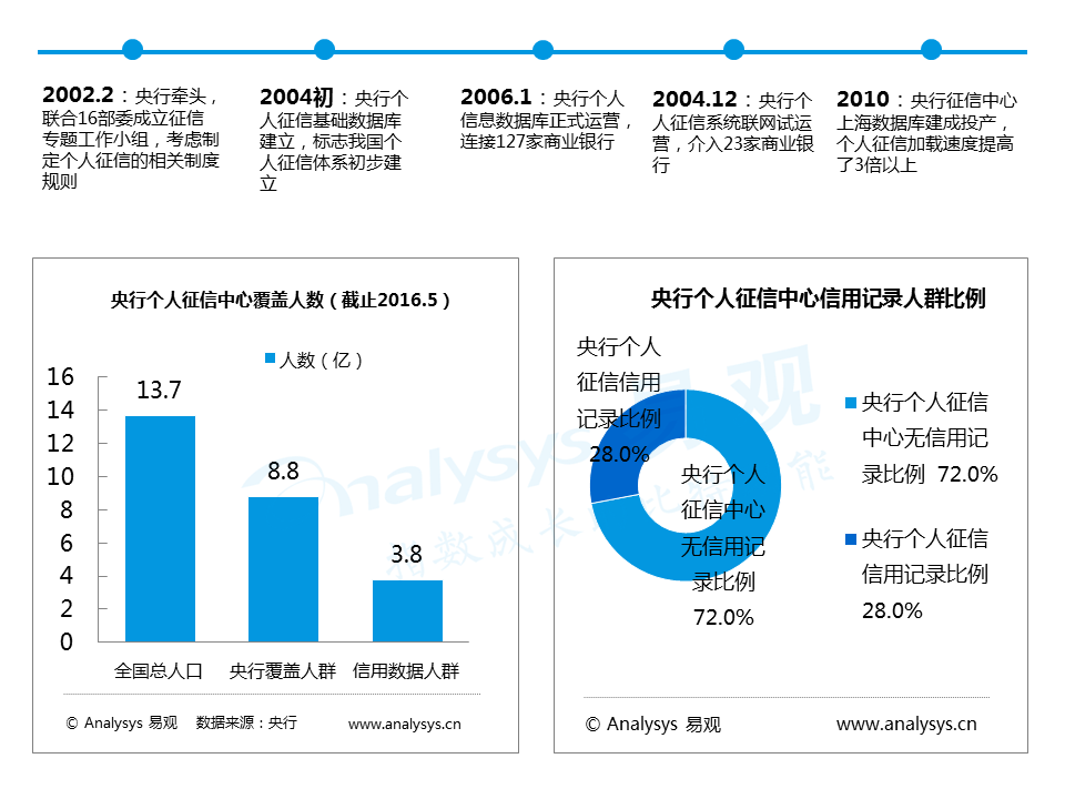1997年,上海资信有限公司成立,经中国人民银行批准在上海市进行个人征信试点。2004年,全国集中统一的个人信用信息基础数据库建成。2015年1月5日,人民银行印发《关于做好个人征信业务准备工作的通知》要求八家机构做好个人征信业务的准备工作,试点单位有芝麻信用,腾讯征信,深圳前海征信等8家机构。