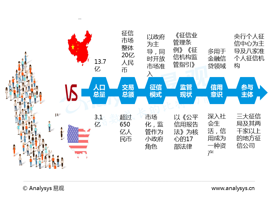 2014年美国个人征信交易总量超过671亿,同期中国征信市场总交易量为20亿。中国人口是美国人口的4.5倍,按美国社会对个人征信的依赖程度来看,国内个人征信市场未来能够达到两千亿的量级。但与美国成熟的市场状况不同,社会信用意识、顶层监管政策等制约国内个人征信行业的发展。