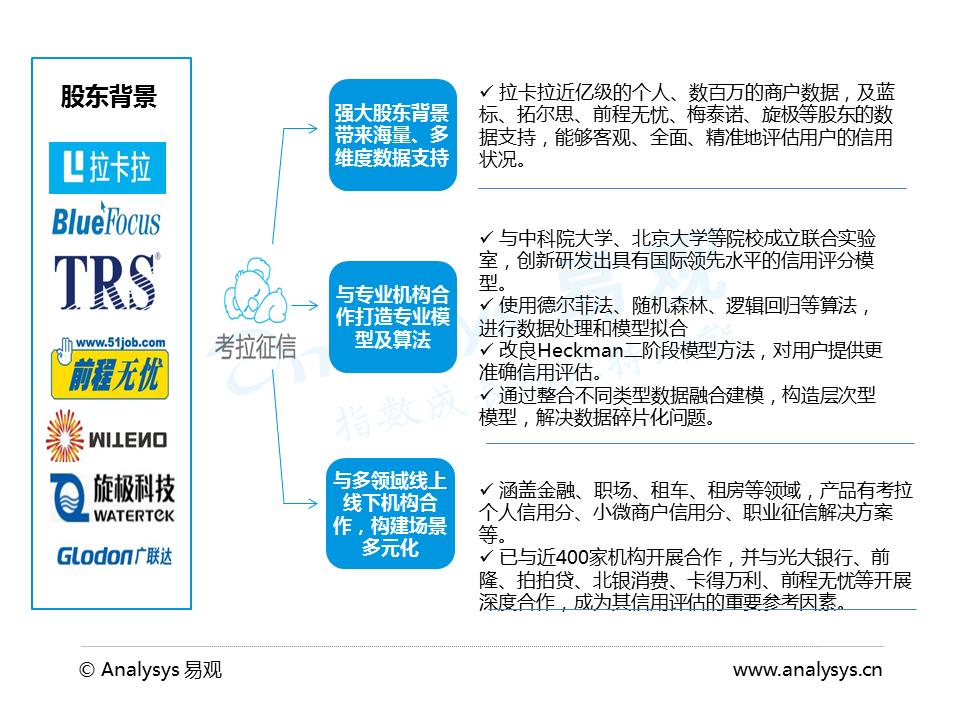 考拉征信由拉卡拉联合蓝标、拓尔思、前程无忧等上市公司共同成立,依托多元的海量数据、领先的大数据处理技术,推出面向政务、商务、社会、法务、个人全方位的信用服务体系,考拉征信的核心竞争力源于其多年的支付行业经历所积累的个人、商户、企业数据以及股东多维度的数据补齐。