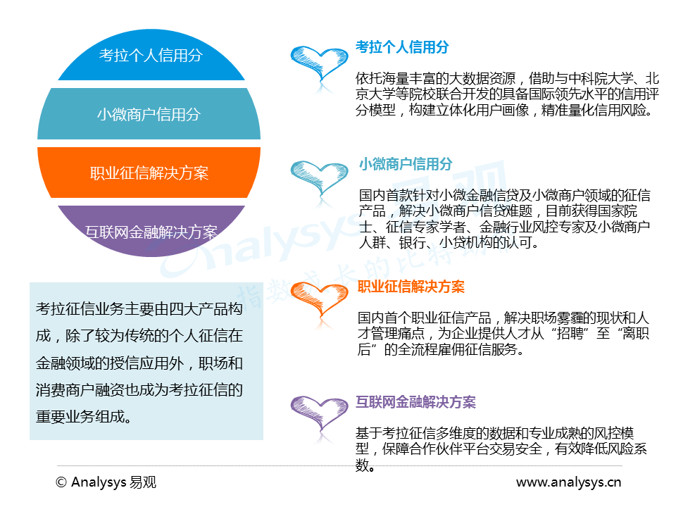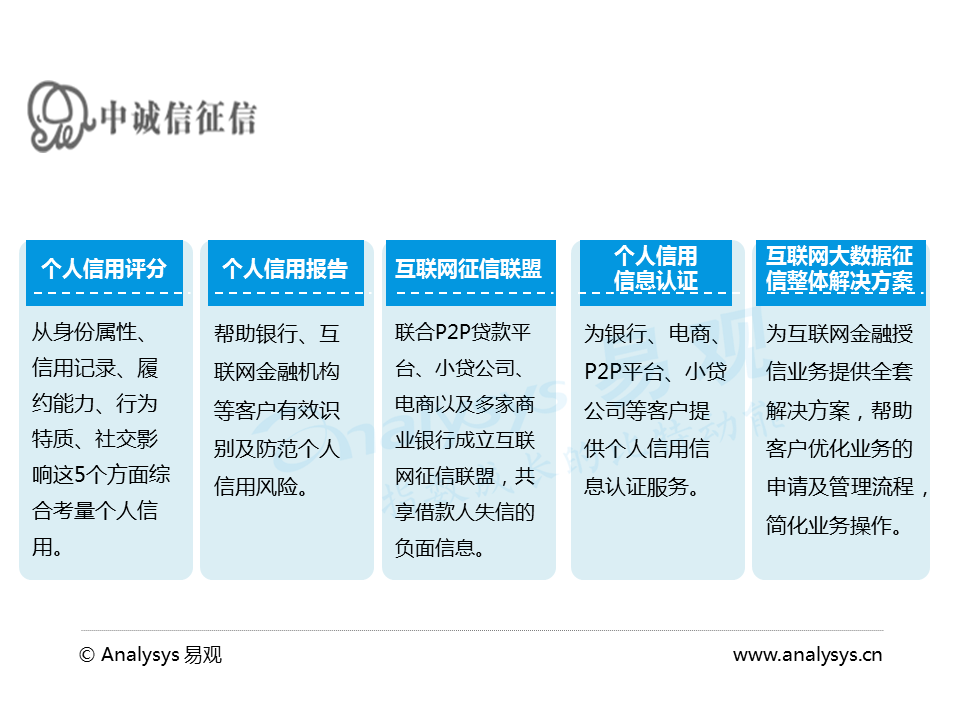 作为完全独立的第三方征信机构,中诚信的优势更多地体现在金融服务领域,通过征集传统数据,利用成熟的模型与评估方法,深耕传统金融服务领域,如反欺诈、黑名单、个人信贷等,目前有着五大产品线。