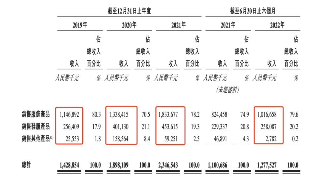 最后是产品单一依赖症。不语的主要售卖衣服和鞋子,招股书显示,2022年上半年销售服饰产品占总收入的79.6%,鞋履产品占据20.1%,两者的营收占比之和接近100%。