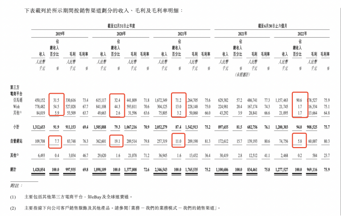 首先是严重的亚马逊依赖症。子不语的销售渠道主要分为第三方电商平台和自营网站。招股书显示,2019年~2021年,子不语来自第三方电商平台的收入分别占比91.9%、79.3%、87.4%,2022年上半年进一步增长至94.0%。