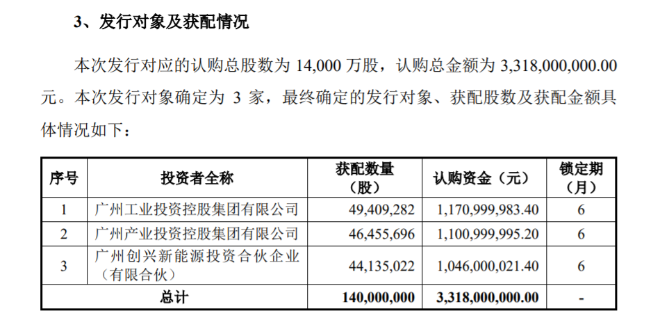 发行对象最终确定为3家,分别为广州工业投资控股集团有限公司(以下简称“广州工控”)、广州产业投资控股集团有限公司(以下简称“广州产控”)和广州创兴新能源投资合伙企业(有限合伙)(以下简称“创兴新能源”)。