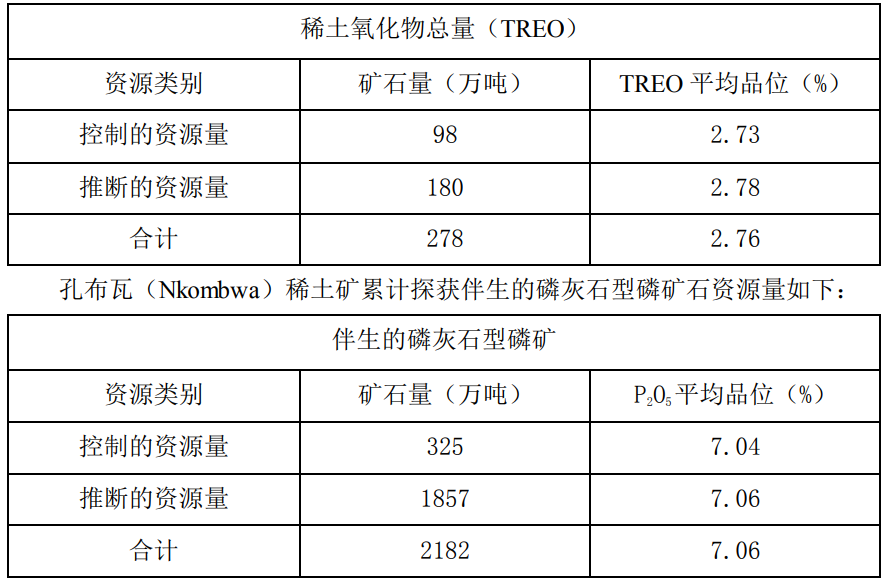 中矿资源11月11日公告,当日,控股子公司中韵矿业发展有限公司(以下简称“中韵矿业”)与中矿国际勘探(香港)控股有限公司(以下简称“香港中矿控股”)签署了《股权转让协议书》,中韵矿业以转让对价500万美元收购香港中矿控股持有的中矿香港稀土资源有限公司(以下简称“中矿香港稀土”)100%股份。中矿香港稀土持有非洲雄狮矿业有限公司(African Inkalamo Mining Company Limited,以下简称:“雄狮矿业”)99%股权,雄狮矿业持有赞比亚孔布瓦(Nkombwa)稀土矿探矿权。孔布瓦(Nkombwa)稀土矿权区内累计探获的稀土矿石资源量如下图所示。