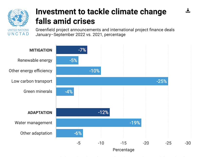 报告表示,原因在于区域战争形势恶化,以及粮食、能源和金融三重危机共同作用,导致的金融状况恶化和投资不确定性给跨境投资带来下行压力。虽然能源危机加速了向绿色转型的进程,这带来了一些希望,但是气候变化投资短期仍无法摆脱外国直接投资的低迷。