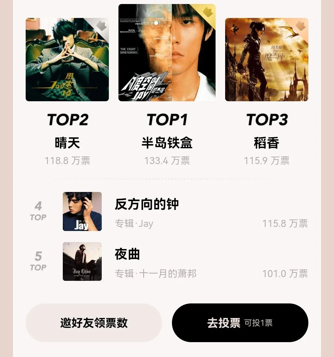 其次,正如快手周杰伦演唱会宣传片中所说,周董演唱曲目将会由网友票选,而这一权限自然也落在了主办方快手的手中,根据快手官方数据显示,目前排名第一的歌曲是《半岛铁盒》,紧随其后的《晴天》《稻香》《反方向的钟》在票数上相近,最终演唱曲目还没有确定。