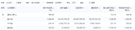 偿付能力报告显示,国华人寿2022年三季度末核心偿付能力充足率、综合偿付能力充足率分别为113.15%、166.58%,相比上季度下降了10.15%、8.49%,且低于行业平均值221.1%、219.14%。