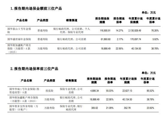 此外,退保率前三的产品为国华华瑞1号年金保险(投资连结型)A款、国华附加鑫账户两全保险(万能型)A款(2015)、国华智多宝终身寿险(万能型)(B账户)。其中,国华华瑞1号年金保险(投资连结型)A款退保金额为4686万元,退保率为55.03%,超过一半。国华人寿表示,这款产品规模较小,对公司的整体业务影响非常小。