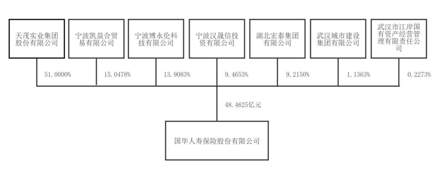 三季报显示,天茂集团(000627.SZ)持有国华人寿24.71亿股份,占总股本的51%,为控股股东,其他6家股东为:宁波凯益合贸易有限公司、宁波博永伦科技有限公司、宁波汉晟信投资有限公司、湖北宏泰集团有限公司、武汉城市建设集团有限公司、武汉市江岸国有资产经营管理有限责任公司,分别持有国华人寿15%、14%、9%、9%、1%及0.23%的股权。