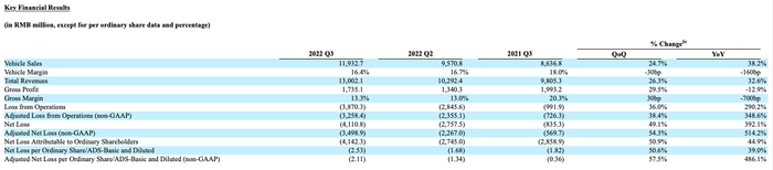 11月10日晚间,蔚来披露了最新的财务报告。数据显示,2022年Q3,蔚来总营收为130亿元,同比增长33%,环比增长25%,略超市场预期,报告期内,蔚来的净亏损为41.1亿元,同比扩大392%,调整后的净亏损为35亿元,相较于去年同期的5.7亿元,蔚来的整体亏损扩大514%。