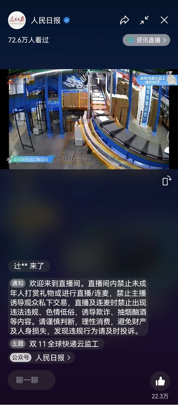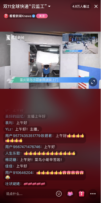 今年10月31日晚8点,天猫双11第一波售卖正式开启。菜鸟持续超11天的全球快递“云监工”直播也随之开启。这也是其连续第三年上线全球快递“云监工”,今年的直播时间从10月31日晚八点到11月11日二十四点,第一次实现多屏同框互动,慢直播镜头和特色直播过程一起看。