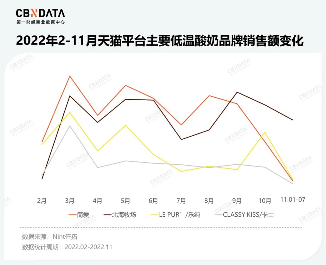除了新生品牌的搅局,大型消费品企业也在利用双11快速推副牌、新系列,以丰富营收来源或完成业务转型。低温乳制品赛道上,元气森林旗下的酸奶副牌北海牧场近年来持续发力。根据Nint任拓数据,今年双11(11.01-11.07)期间超越简爱、卡士、乐纯等低温酸奶头部玩家,登顶低温酸奶赛道销售额榜首。气泡水之后,元气森林一直在寻找新的增长引擎。但除外星人以外,乳茶、有矿、对策等副牌大多表现平平。北海牧场或许可以为元气森林带来新的增量。