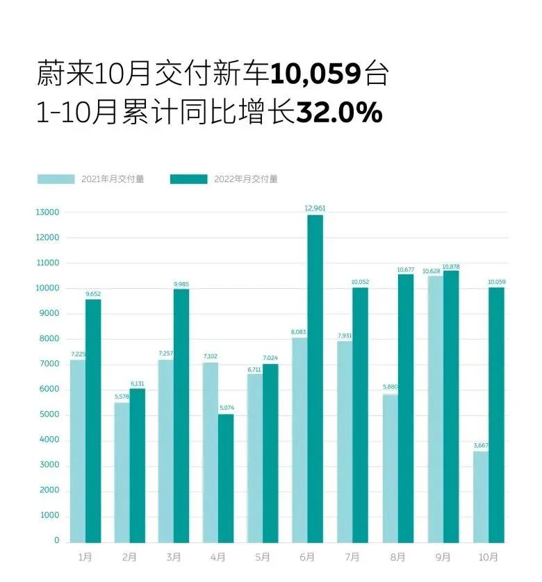 然而,被寄予厚望的四季度,开局称不上顺利。蔚来10月交付新车10059台,同比增长174.3%。环比下降7.5%。按照交付指引,四季度车辆交付量在4.3万至4.8万辆之间。11和12月份,蔚来的平均交付要超过1.6万。