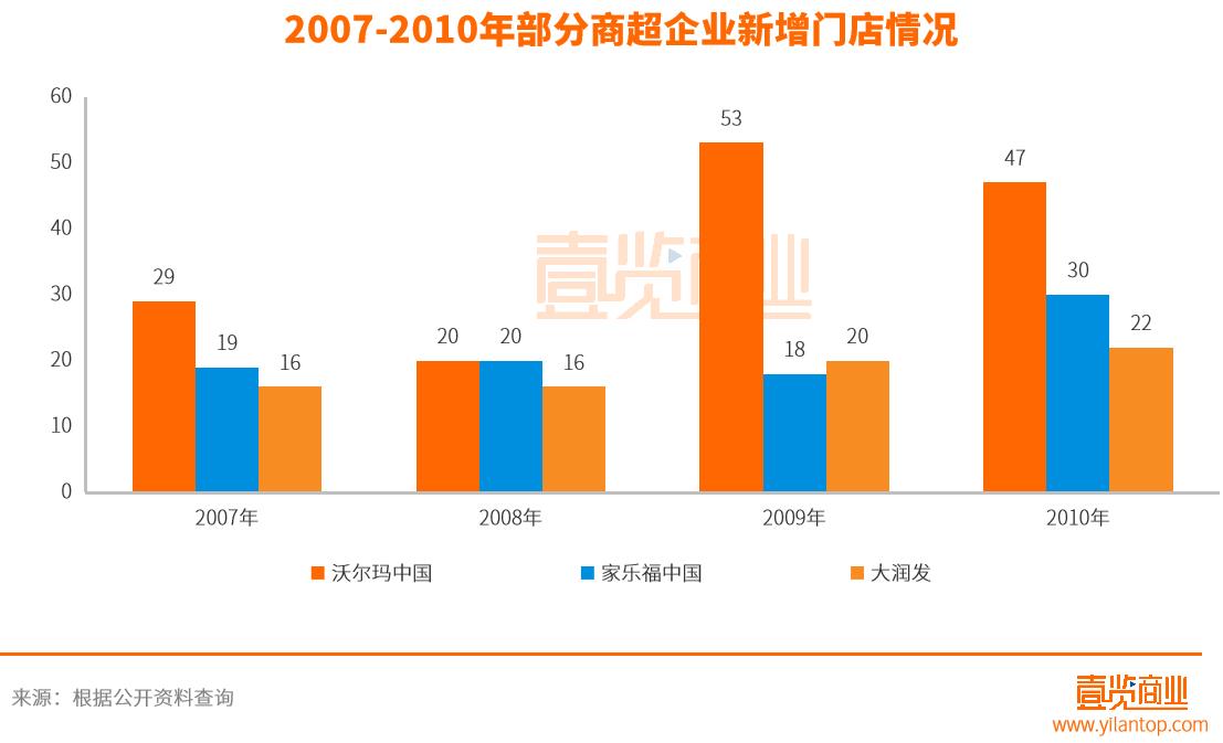 其次,实体零售市场还属于大卖场时代。彼时,大卖场正处于高速发展的黄金二十年时期,无论是门店扩张还是业绩均在快速增长阶段。数据显示,2009年,商超业态门店数量增长22.2%,销售增长12.3%。其中,像大润发、沃尔玛中国等多家超市企业均在快速跑马圈地。